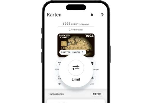 Wählen Sie «Limit» im Abschnitt «Karten», um Ihr Globallimit zu sehen. Falls die Option einer temporären Erhöhung des Limits verfügbar ist, sehen Sie den Button «Erhöhen». Damit können Sie eine Erhöhung Ihres Ausgabenlimits für 30, 60 oder 90 Tage beantragen.