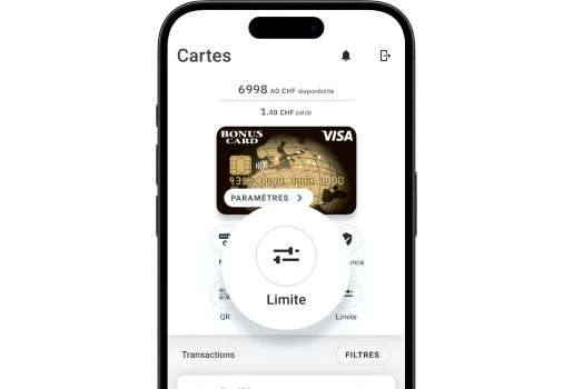Cliquez sur «Limite» dans la section «Cartes» pour visualiser votre limite générale. Si vous avez la possibilité d'augmenter la limite temporaire, vous verrez le bouton «Augmenter», qui vous permettra de demander une augmentation de votre limite de dépenses pour une période de 30, 60 ou 90 jours.